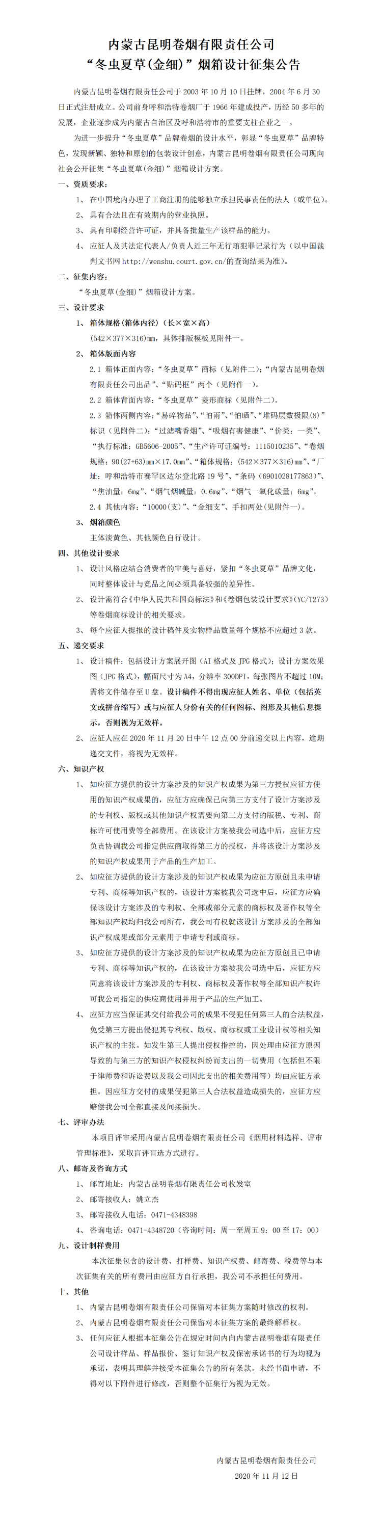 內(nèi)蒙古昆明卷煙有限責(zé)任公司“冬蟲夏草(金細(xì))”煙箱設(shè)計(jì)征集公告
