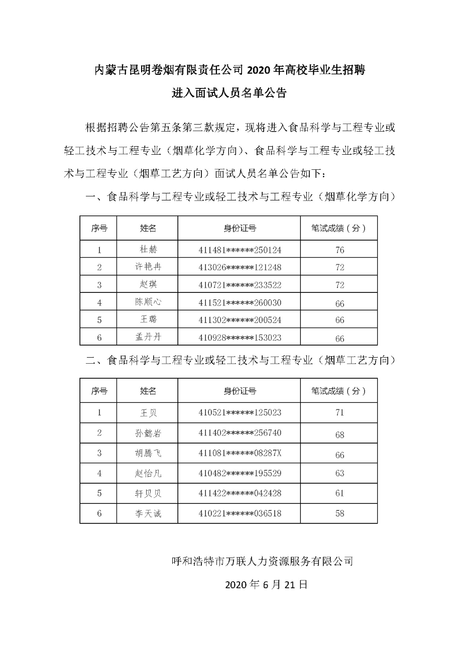 內(nèi)蒙古昆明卷煙有限責(zé)任公司2020年高校畢業(yè)生招聘進(jìn)入面試人員名單公告