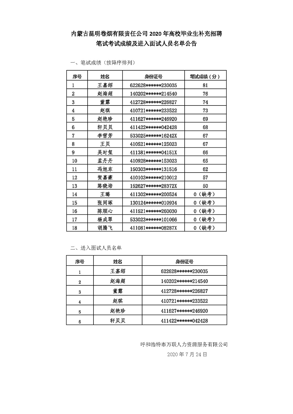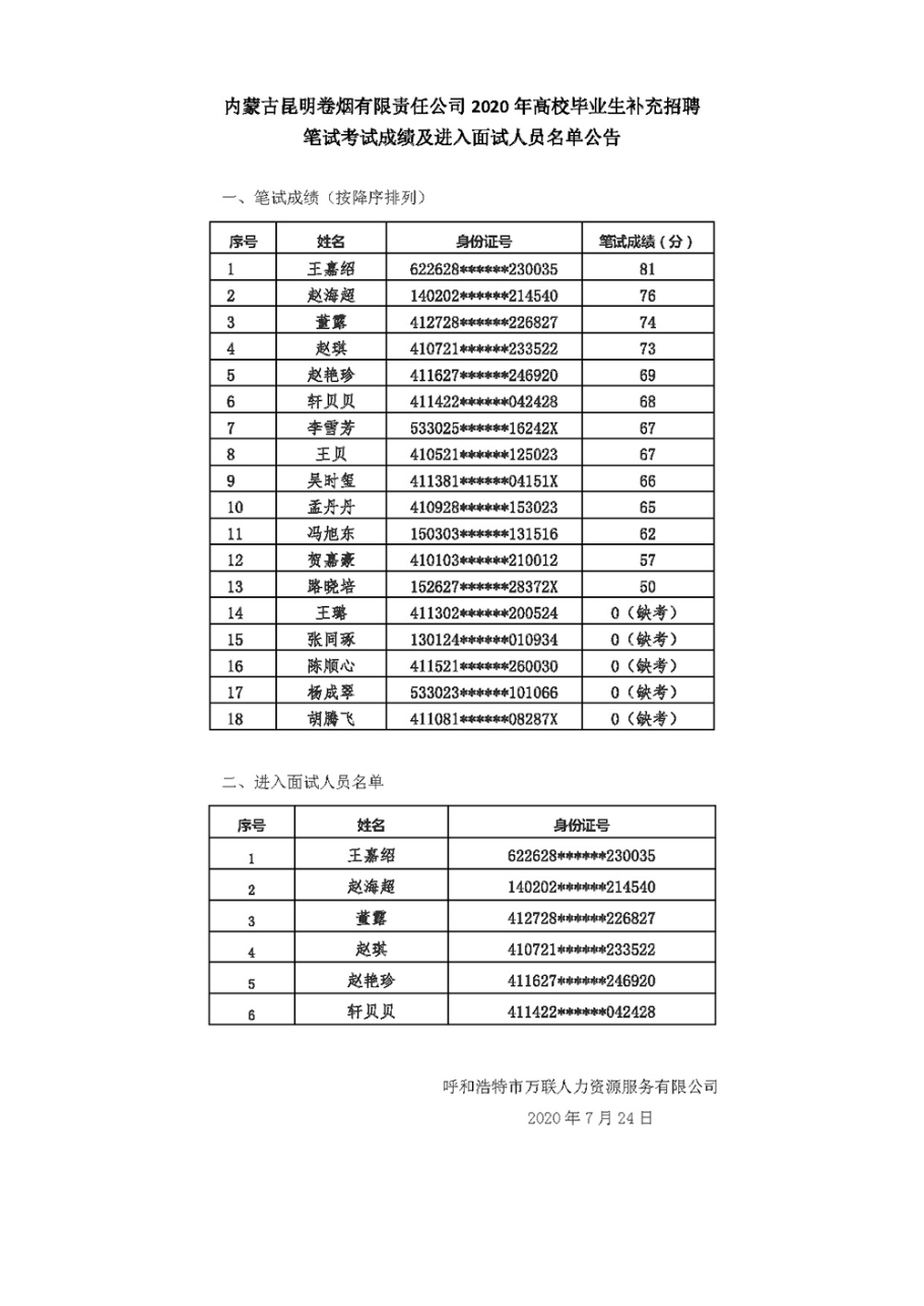 內(nèi)蒙古昆明卷煙有限責(zé)任公司2020年高校畢業(yè)生補充招聘筆試考試成績及進(jìn)入面試人員名單公告