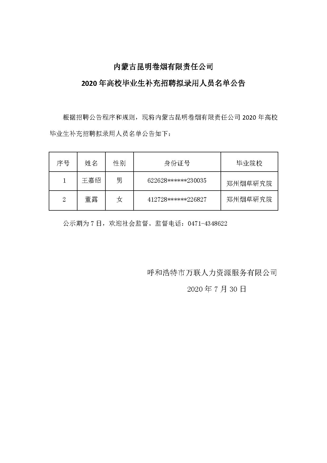 內(nèi)蒙古昆明卷煙有限責(zé)任公司2020年高校畢業(yè)生補(bǔ)充招聘擬錄用人員名單公告