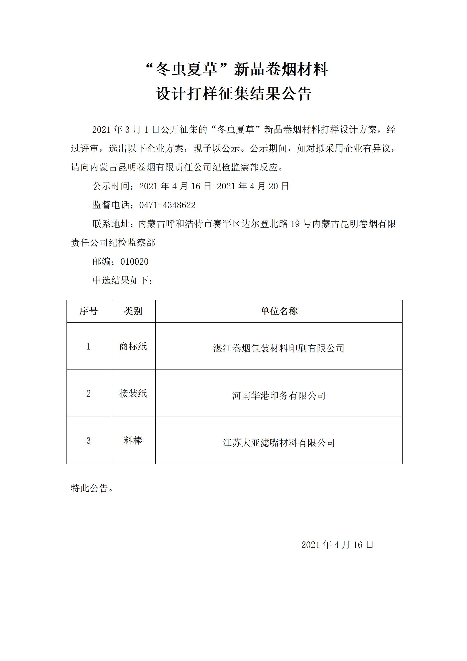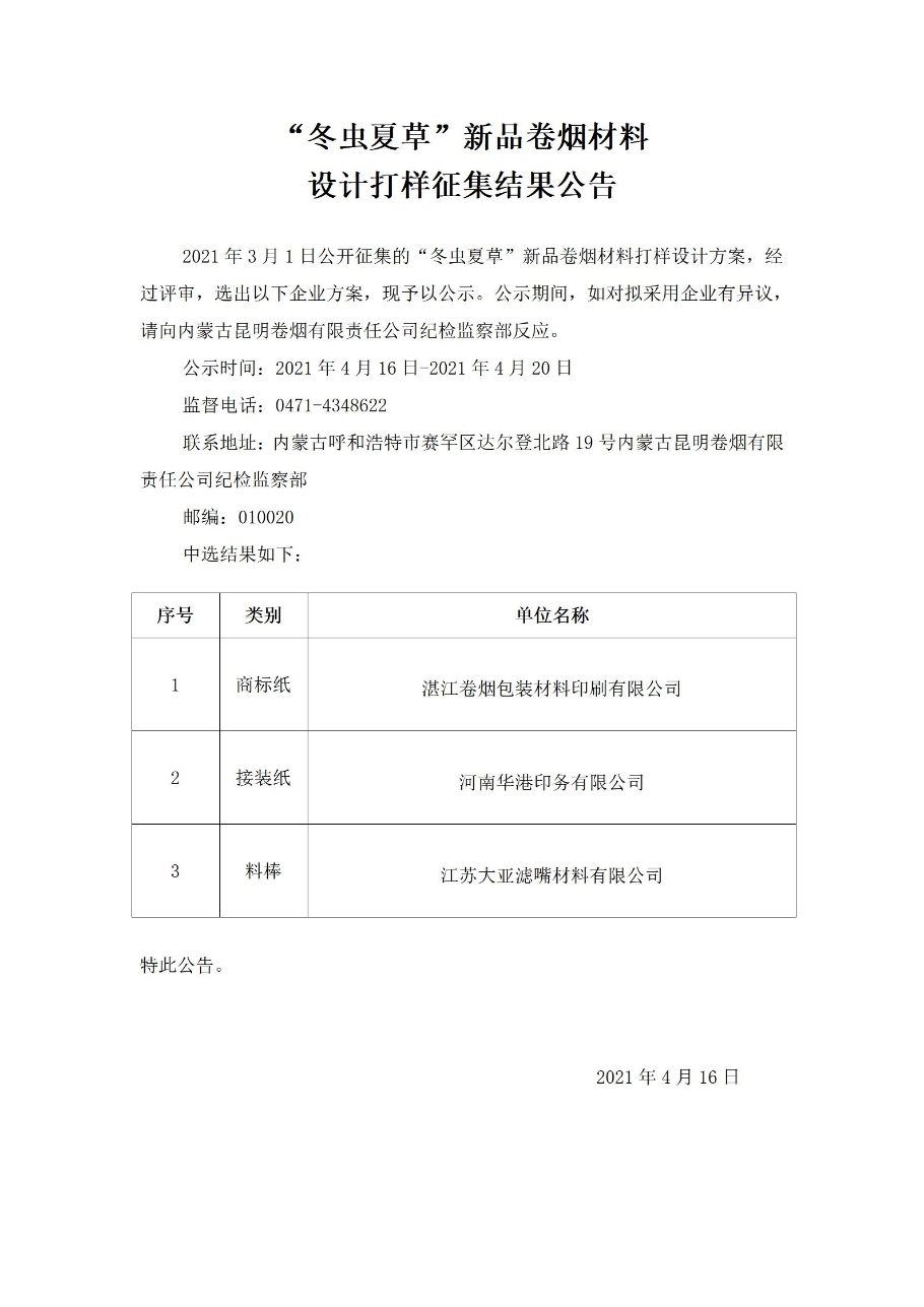 “冬蟲夏草”新品卷煙材料設(shè)計(jì)打樣征集結(jié)果公告