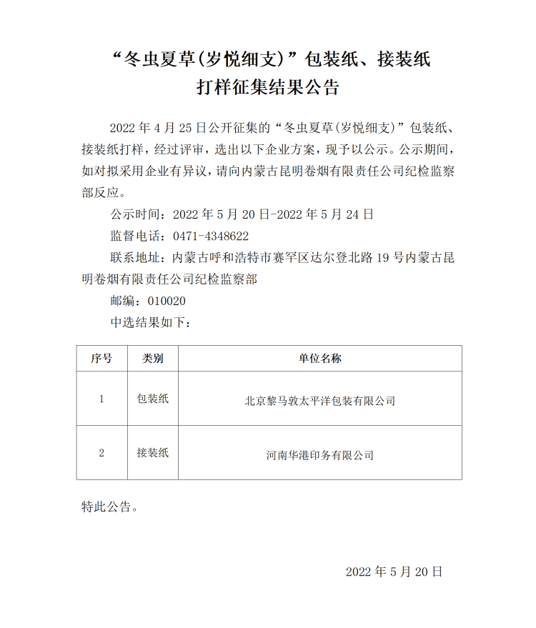 “冬蟲夏草(歲悅細(xì)支)”包裝紙、接裝紙打樣征集結(jié)果公告
