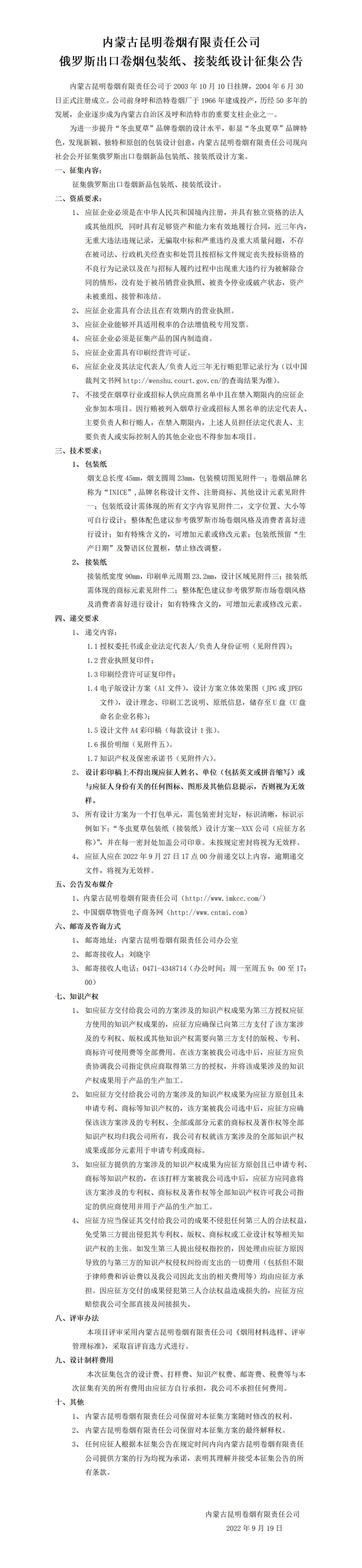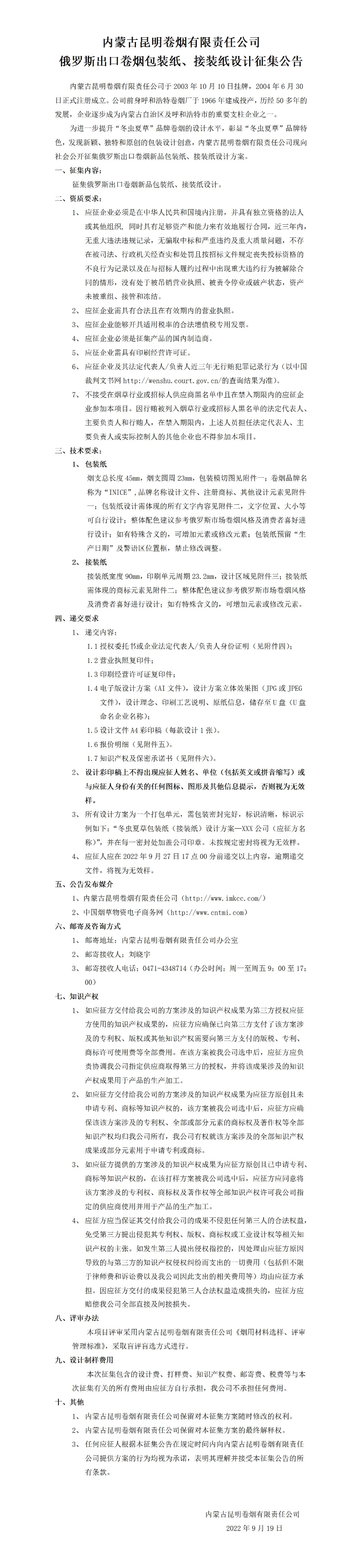 內(nèi)蒙古昆明卷煙有限責任公司俄羅斯出口卷煙包裝紙、接裝紙設(shè)計征集公告