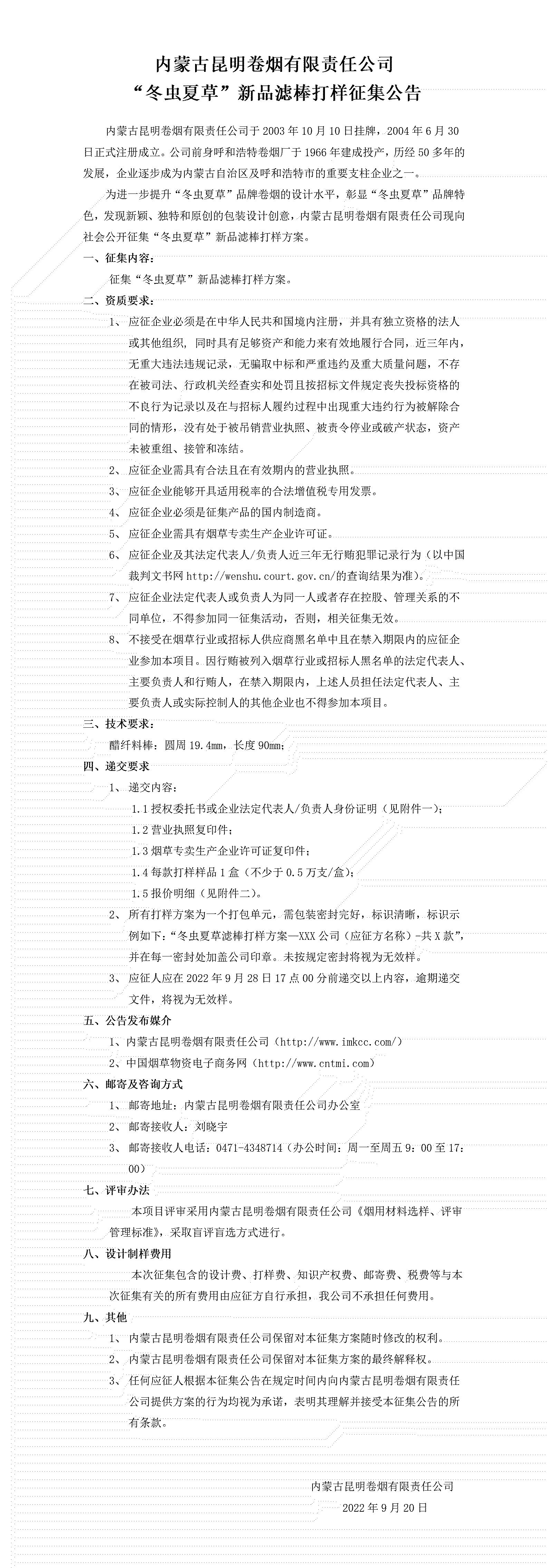 內(nèi)蒙古昆明卷煙有限責(zé)任公司“冬蟲(chóng)夏草”新品濾棒打樣征集公告