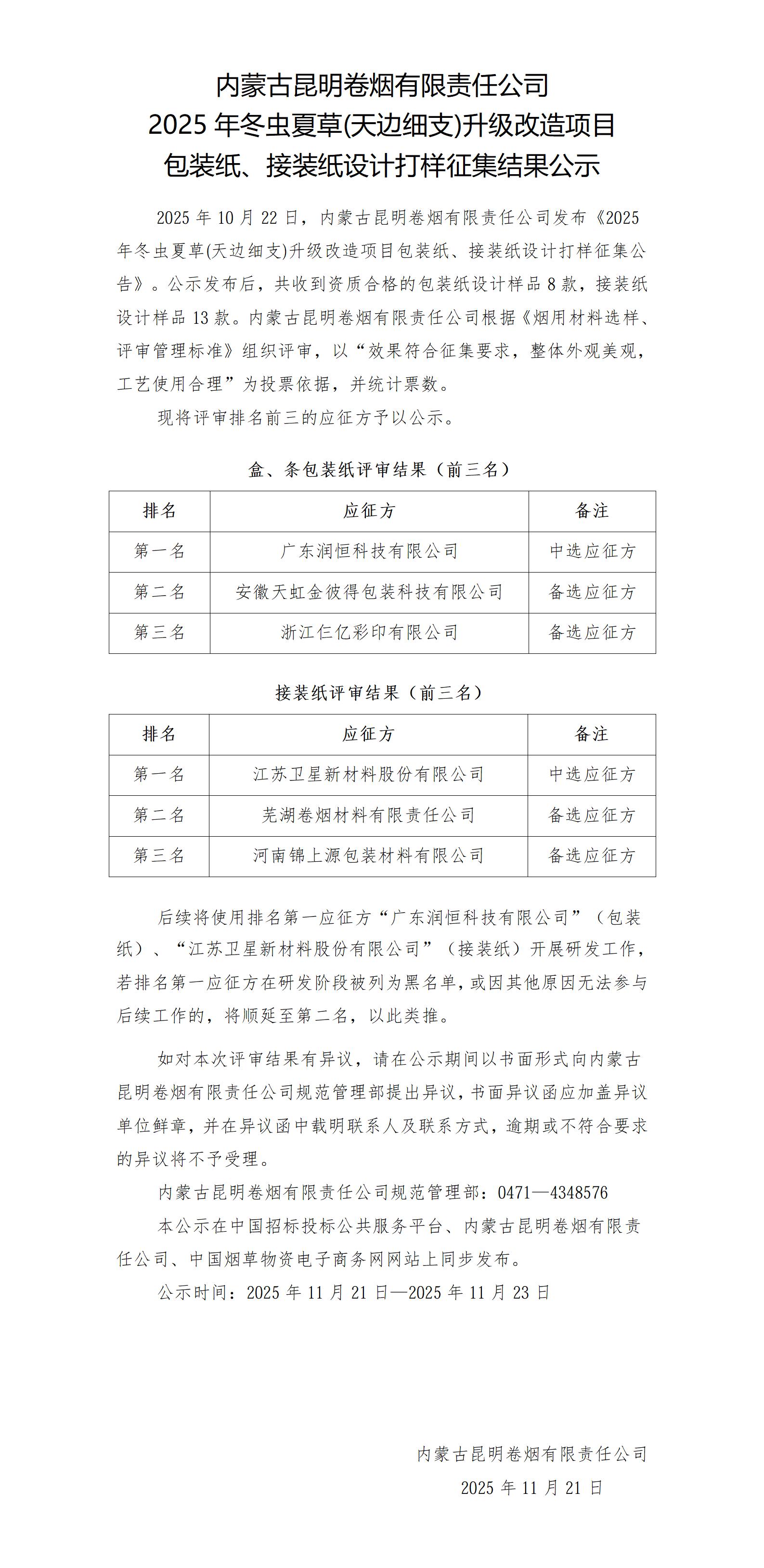 蒙昆公司2025年冬蟲夏草(天邊細支)升級改造項目包裝紙、接裝紙設(shè)計打樣征集結(jié)果公示